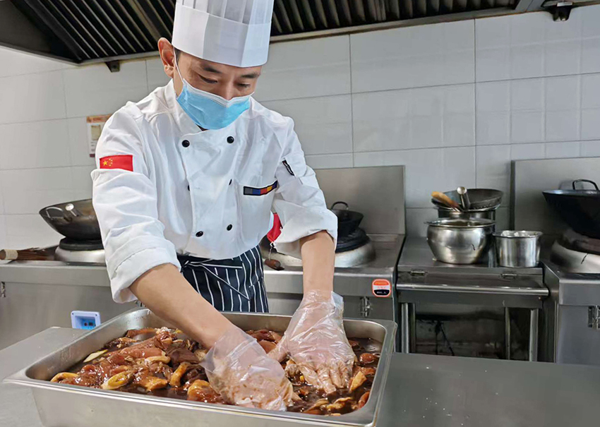 福瑞瀾德的廚師正在專注處理新鮮原材料,精準配比調料、均勻裹覆揉搓,以耐心鎖鮮入味,只為做好每份美食,點亮食客舌尖。